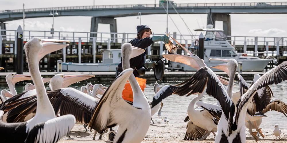 The daily pelican feeding is a favourite for visitors to the Bass Coast.